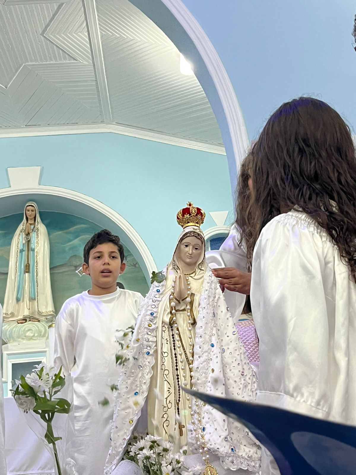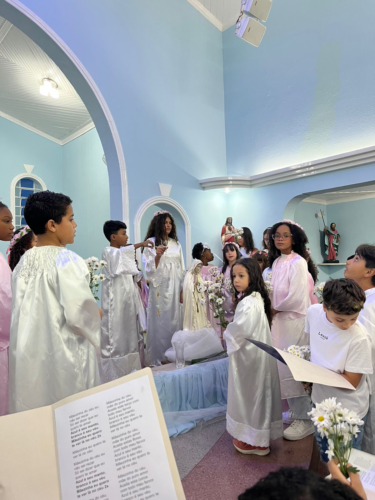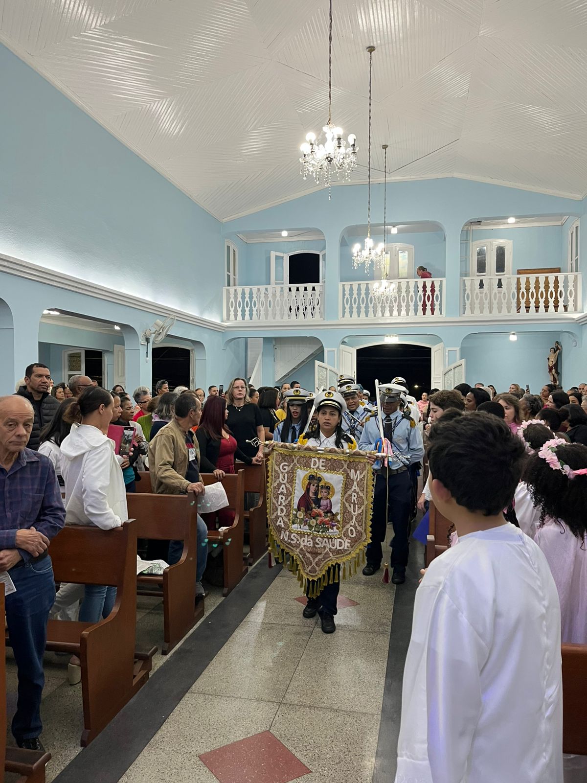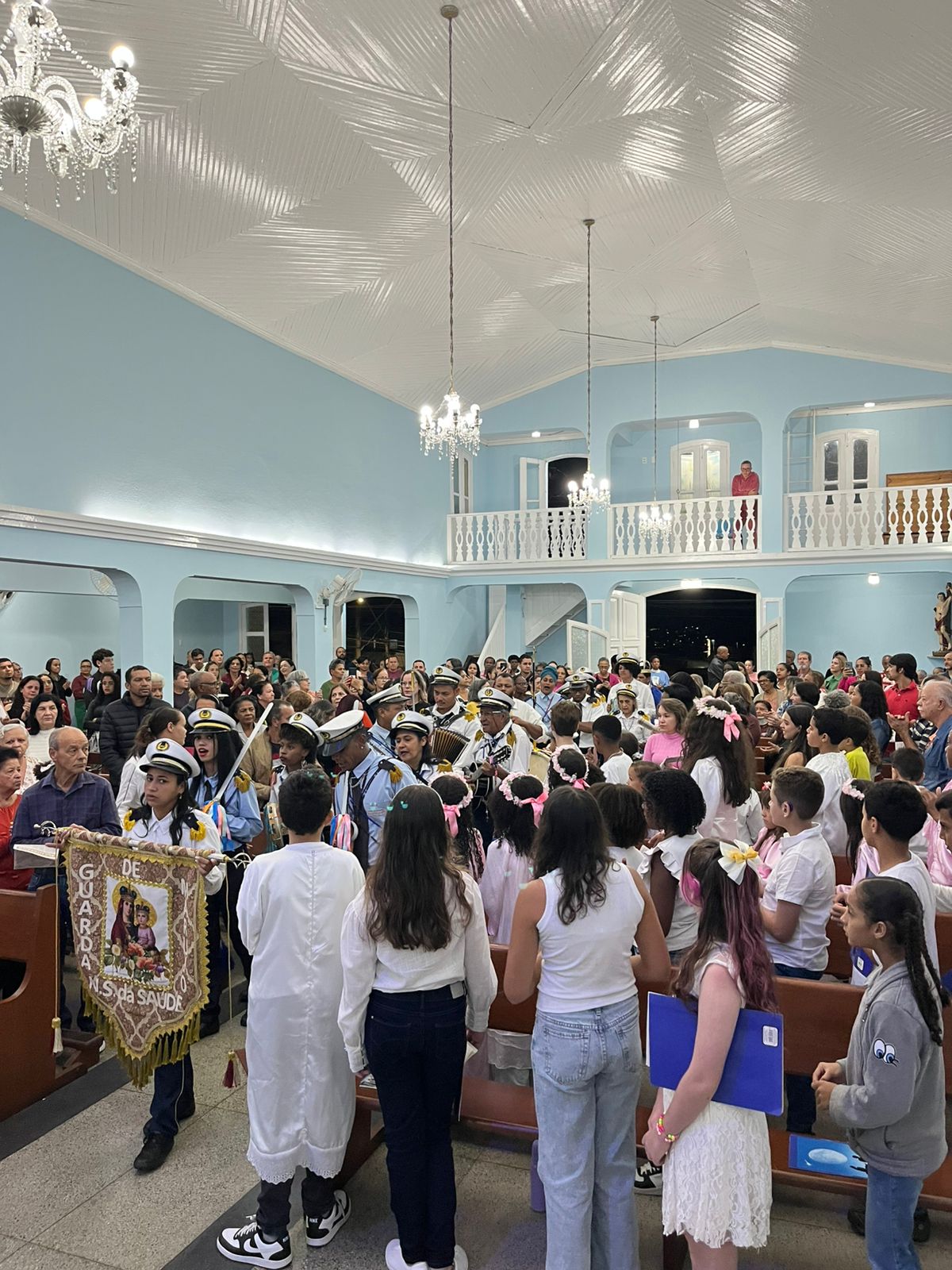 Durante a celebração, as crianças prestaram uma bela homenagem à Virgem Maria, enchendo de ternura e esperança o coração da comunidade. A presença da Guarda de Marujos Nossa Senhora da Saúde abrilhantou ainda mais o momento, reforçando a tradição e a religiosidade popular.